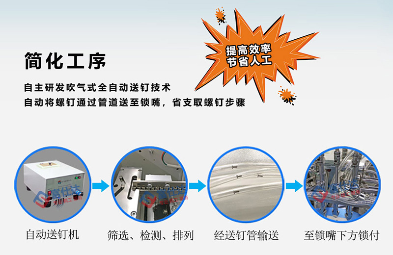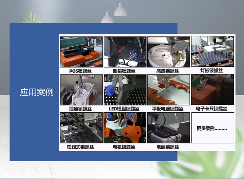 設備主要由自動送釘機、多軸鎖付系統、多工位作業臺、機械手臂等機構組成,根據產品螺絲數量定制多軸鎖付系統及自動送釘數量,達到一次輸送并擰好所有螺絲的效果,大幅提升效率,簡化工序。